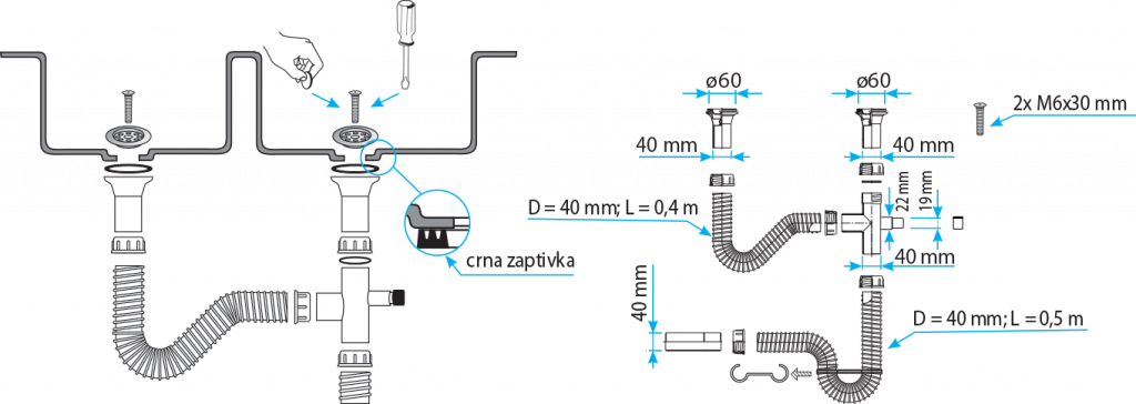 FLEKSIBILNI SIFON ZA SUDOPERE SA PRIKLJUČKOM ZA MAŠINU DVODELNI